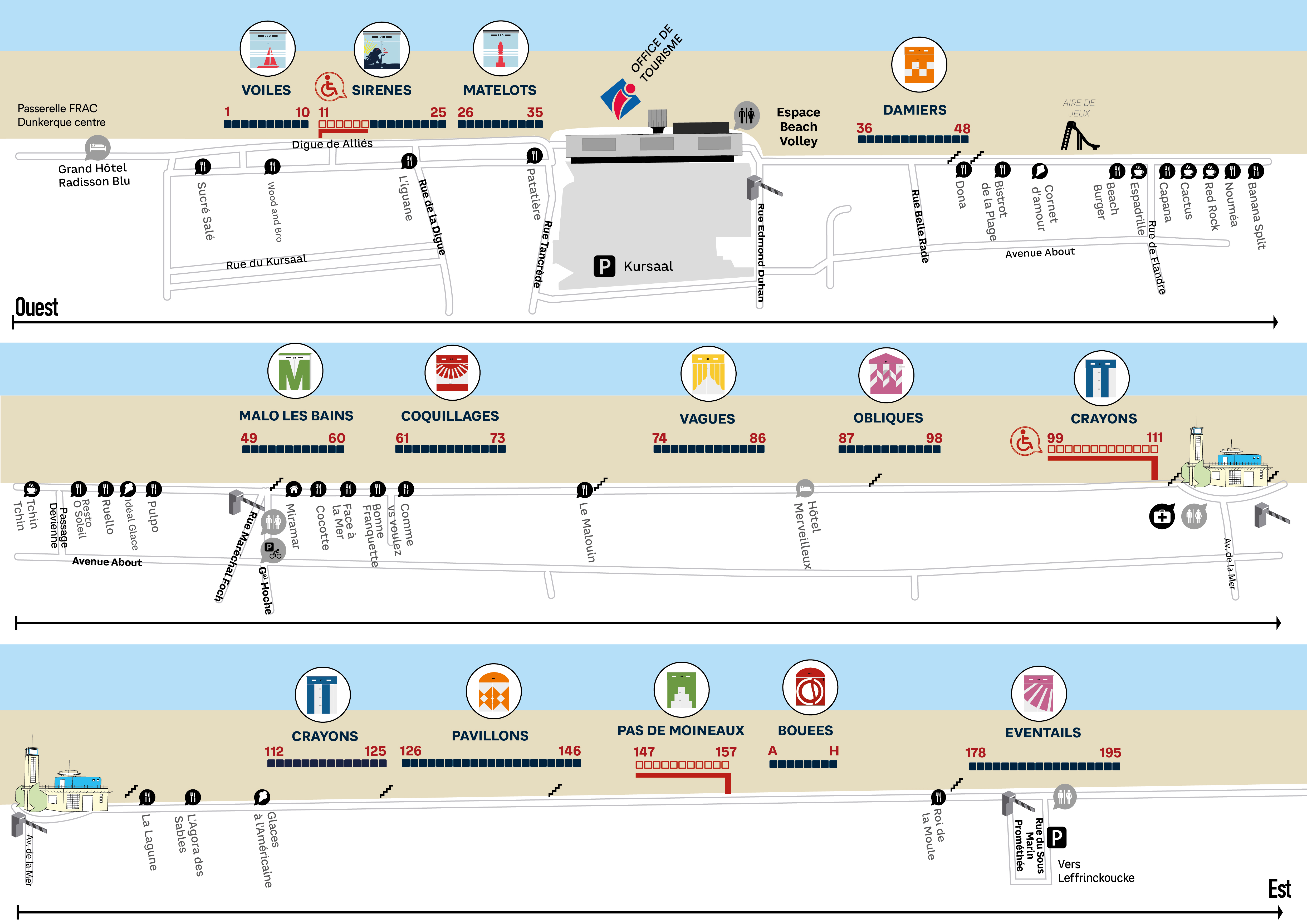 Une famille devant les kiosques de la plage de Malo-les-Bains