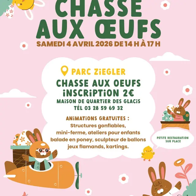 Chasse aux œufsPour participer à la chasse aux œufs, une inscription est obligatoire avec une participation de 2 €.