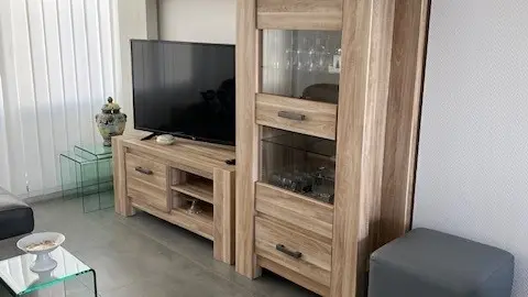 comprenant : une chambre avec un lit 190x140, un séjour avec un canapé convertible 190x140, une salle de bains avec baignoire à porte, une cuisine séparée comprenant réfrigérateur, congélateur, four électrique et micro onde. Machine à laver, sèche cheveux, cafetière. Non fumeur