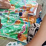 Sur un grand tapis illustré, les enfants accompagnent Miss Chardon dans une aventure à travers la ville.