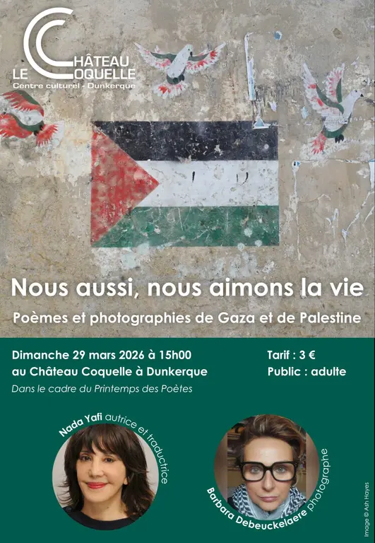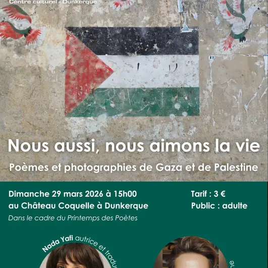 Nada Yafi, autrice qui a sélectionné et traduit les poèmes édités dans le recueil Que ma mort apporte l'espoir, poèmes de Gaza, nous présentera cet ouvrage aux côtés de la photographe Barbara Debeuckelaere qui introduira le livre Om/Mother réalisé avec 8 femmes palestiniennes de Hébron en Cisjordanie. Une des femmes photographes interviendra également en visioconférence depuis la Palestine. Avec cet événement, il s'agit d'explorer l'acte de création en photographie et en poésie comme un acte de résistance. Avec la participation de l'association AFP Dunkerque-Gaza.