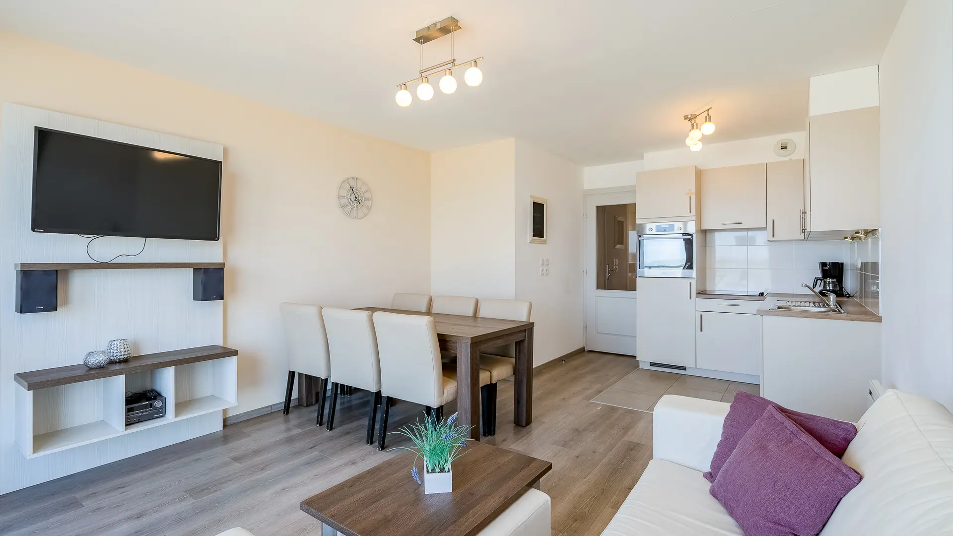 Tous les appartements, de 4 à 6 personnes, offrent le même niveau d’équipement et de confort (Balcon, TV, cuisine ouverte et équipée avec lave-vaisselle).