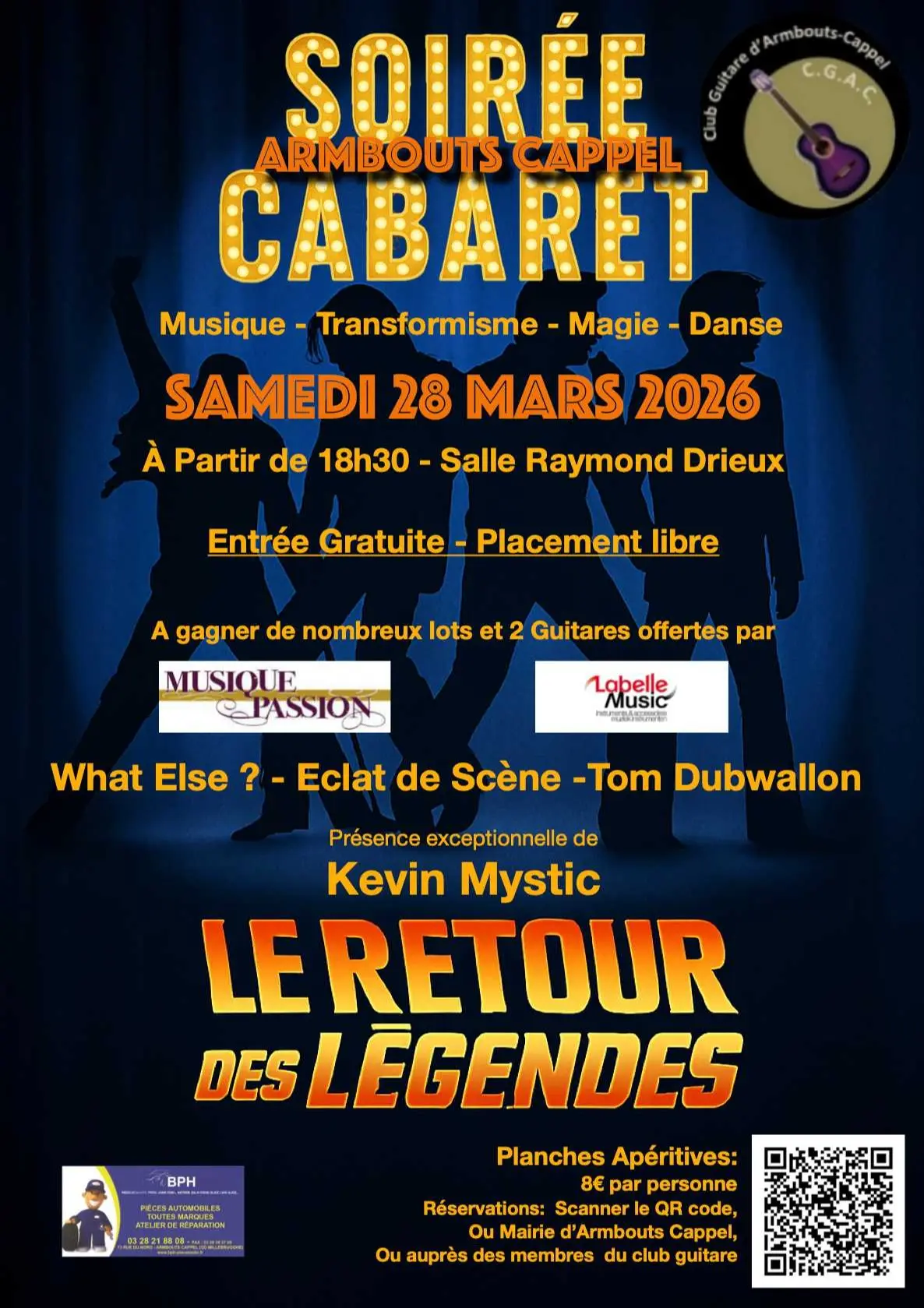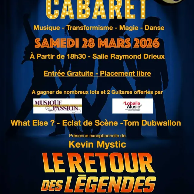 Le Club Guitare Armbouts-Cappel organise la Soirée Cabaret 2026, le samedi 28 mars 2026 à 19h00, à la Salle Raymond Drieux d'Armbouts-Cappel. La soirée sera présentée et animée magiquement par Tom Dubwallon. Au programme de la soirée : What Else ? (groupe variété/rock), Tom Dubwallon (magie), Kevin Mystic (artiste transformiste) et Eclat de Scène (danse cabaret).Réservation sur HelloAsso, entrée gratuite. Placement libre. Planches apéro sur réservation Bar et petite restauration (hot-dog, crêpes) sur place.