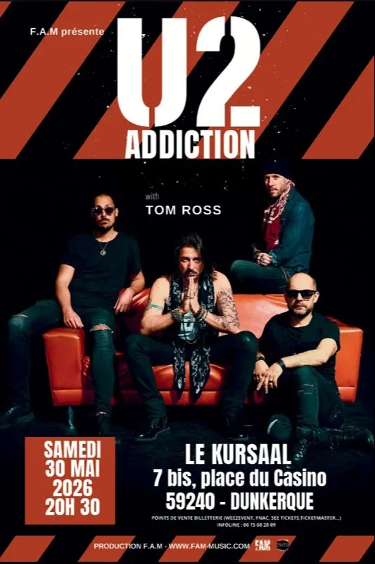 Bien connu pour son rôle dans la comédie musicale Roméo et Juliette et sa participation à l'émission The Voice, Tom Ross est le chanteur du groupe U2 ADDICTION composé du guitariste Jocelyn Dupuis, du bassiste Laurent Bebin et du batteur Hugo Sarton. De "With Or Without You" à "Sunday, Bloody Sunday" en passant par " Pride ", le groupe reprend à la note près les tubes historiques du quatuor irlandais.